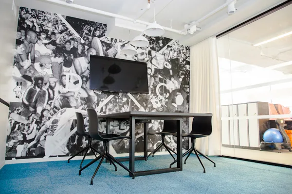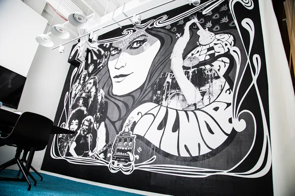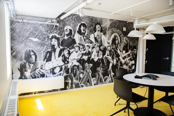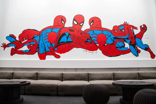 The New York offices of Spotify at 45 West 18th Street are home to a serious street art program — not the obligatory mural in the breakroom, but a permanent, museum-quality installation curated by Redboy. The office walls were transformed into oversized works by WK, ASVP, Kostas Seremetis, and ChrisRWK. Spotify commissioned a real exhibition that their employees and guests live inside every day.