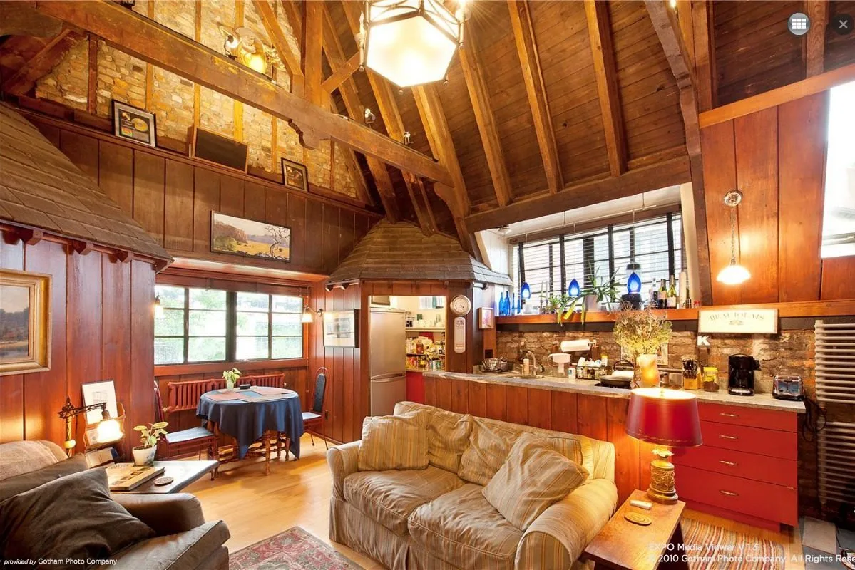 The original structure at 102 Bedford Street dates to 1830, but what stands there now is something far more eccentric. In 1925, architect Clifford Reed Daily borrowed a substantial sum from financier Otto Kahn and set about renovating the building into his vision of an “island growing in a desert of mediocrity” — a ten-unit, two-towered wooden cabin that looks like it belongs in a Swiss forest rather than lower Manhattan.